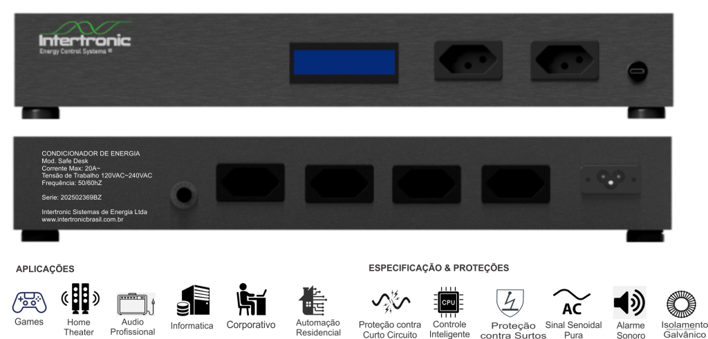 Os condicionadores de energia Intertronic Safe Desk Pro e Safe Desk ISO são poderosos filtros de linha microprocessados, projetados para oferecer proteção robusta e tecnologia avançada em ambientes residenciais, corporativos, escritórios, estúdios musicais e rádios.